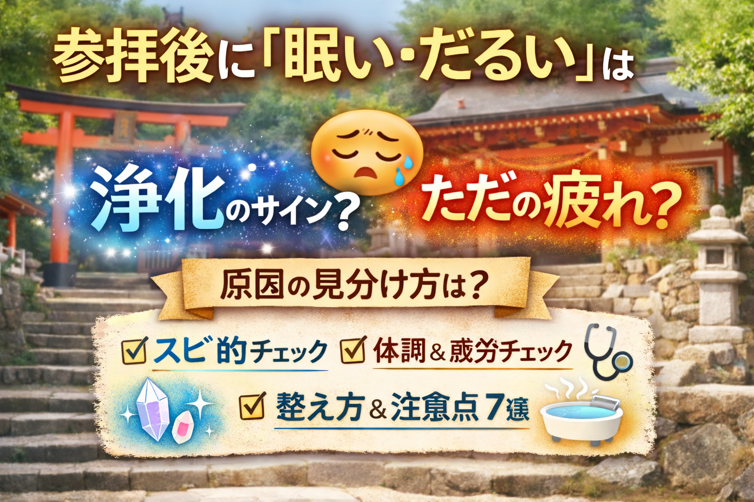 神社やお寺に参拝したあと、急に眠くなったり、体がだるくなったり。「これって浄化なの?それとも単に疲れただけ?」と気になる人は多いはずです。結論から言うと、“浄化っぽい反応”に見えても、現実的な疲労や体調のサインが混ざることが多いです。だからこそ、両方の視点で見分けるのがいちばん安心。この記事では、スピリチュアルな捉え方を大切にしつつ、体調管理としても役立つ「見分け方」と「整え方」をまとめます。 参拝後に眠く・だるくなるのはよくあること 参拝は「静かな場所を歩く」「気持ちを整える」「人混みや移動がある」など ...